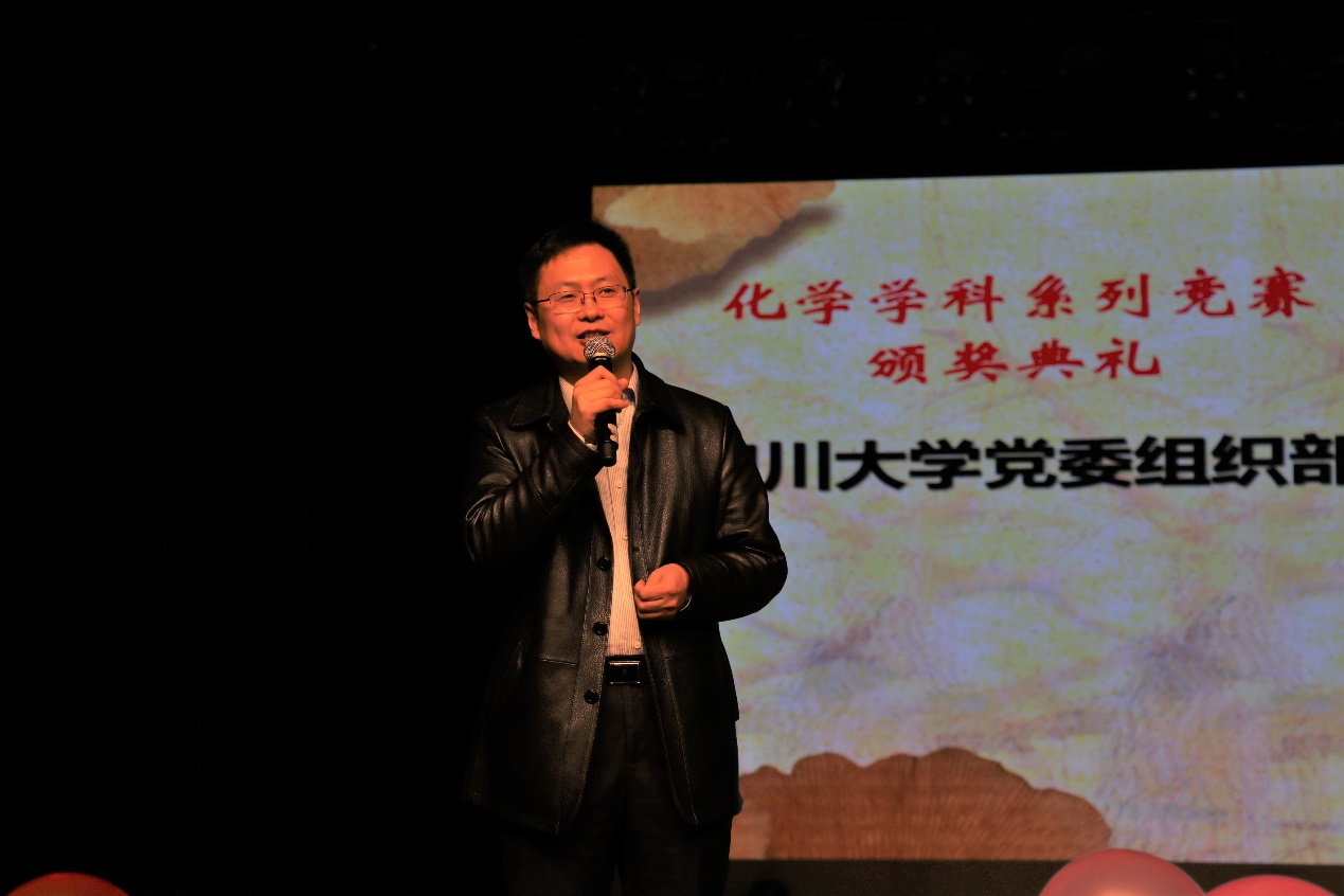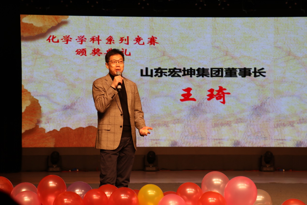 化学学科系列竞赛颁奖典礼在化学学院合唱团表演的歌曲《不忘初心》中拉开序幕。颁奖典礼由化学学院党委副书记谢均主持。四川大学校友联络办公室贾秀娥,四川大学党委组织部副部长、化学学院党委书记王智猛先后致辞,对山东宏坤集团和杰出校友王琦先生表示感谢,对获奖同学表示热烈祝贺。王琦先生在致辞中表达了对同学们认真学习知识、提高个人素质、推动社会进步的殷切期望。部分嘉宾为第六届“宏坤·银杏杯”化学知识竞赛和首届全国大学生化学实验创新设计竞赛特等奖获奖选手颁发了奖状。
