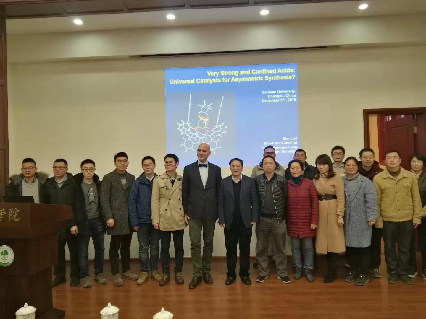 2019年12月5日上午10点,应四川大学化学学院邀请,德国马普煤炭所(Max-Planck-Institut für Kohlenforschung)Benjamin List教授在化学馆321会议室做了题为“Very Strong and Confined Chiral Acids:Universal Catalyst for Asymmetric Synthesis?”的学术报告。此次报告由化学学院冯小明教授主持,陈应春教授、刘小华教授、、Jason Chruma教授、高戈教授、付海燕教授、曾小明教授、郑柯教授、王天利教授、余达刚教授、林丽丽教授、董顺喜研究员、朱剑波研究员、张琪研究员、成楚旸研究员、曹伟地副研究员、付绍敏副研究员等及部分学生参加了此次报告会。