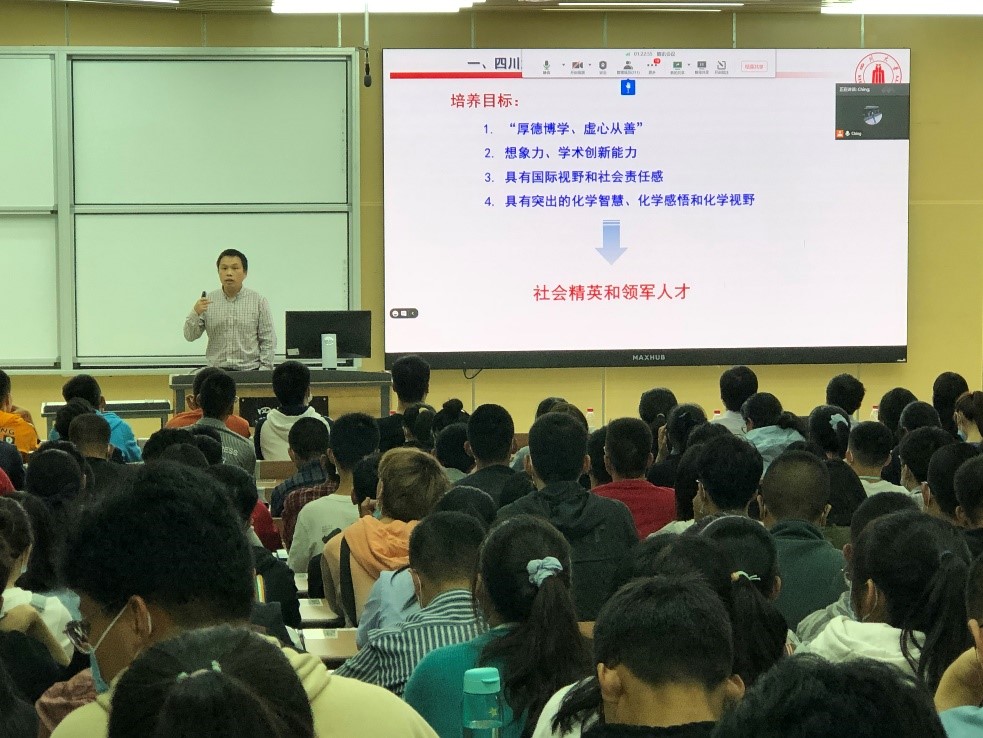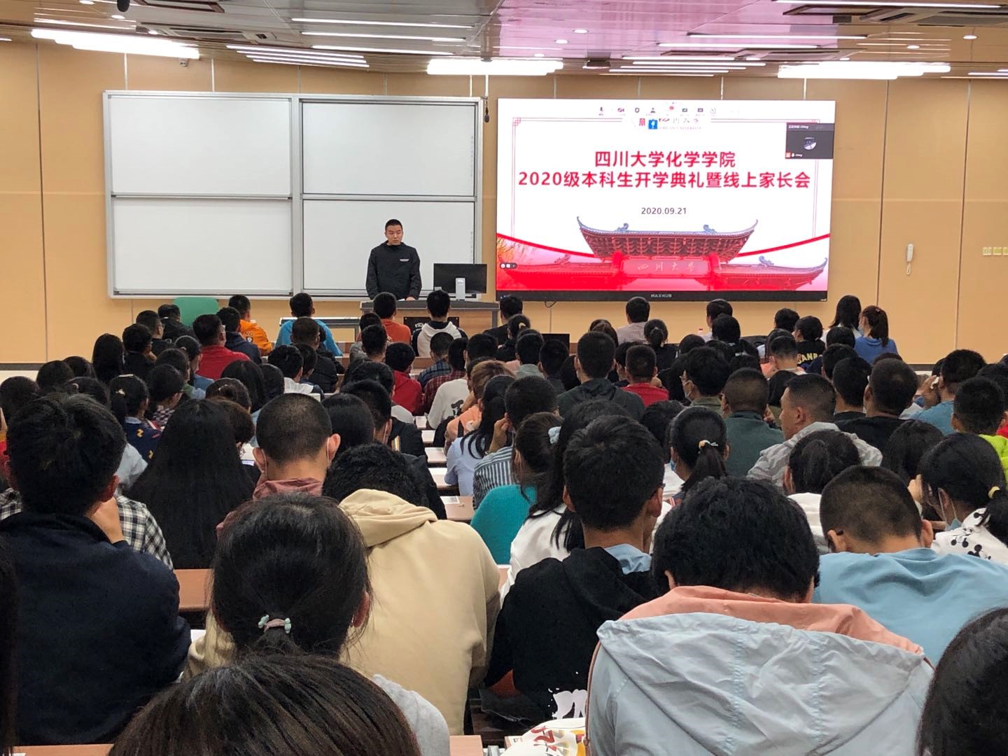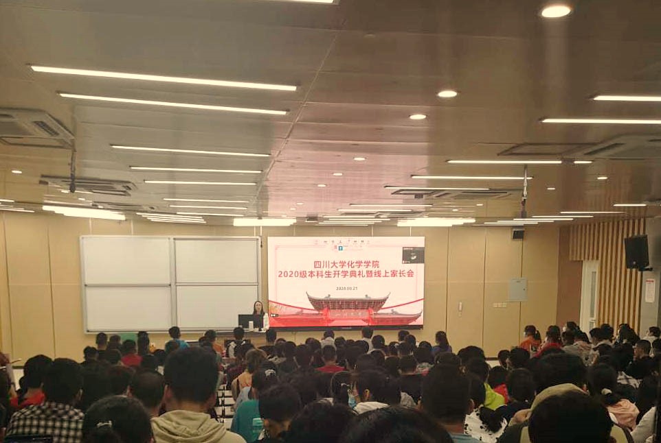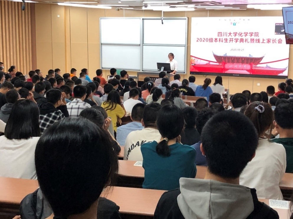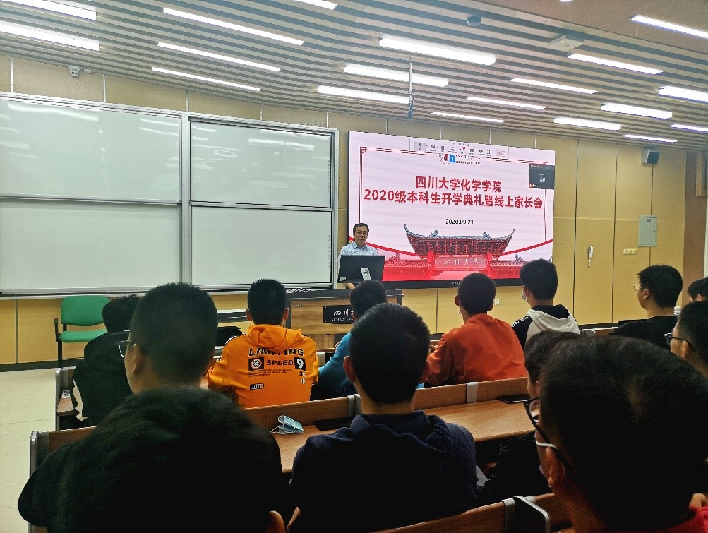 2020年9月21日晚,四川大学化学学院2020级本科新生开学典礼暨线上家长会在江安校区综合楼C座307教室进行。化学学院党政领导、辅导员和全体2020级本科新生参加。同时邀请了新生家长线上参加本次新生开学典礼暨线上家长会。
