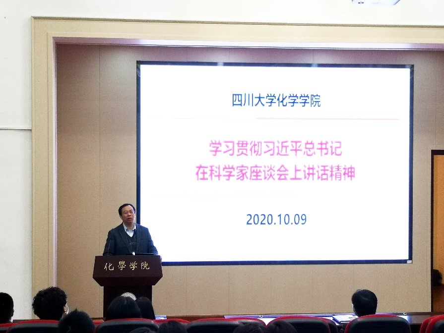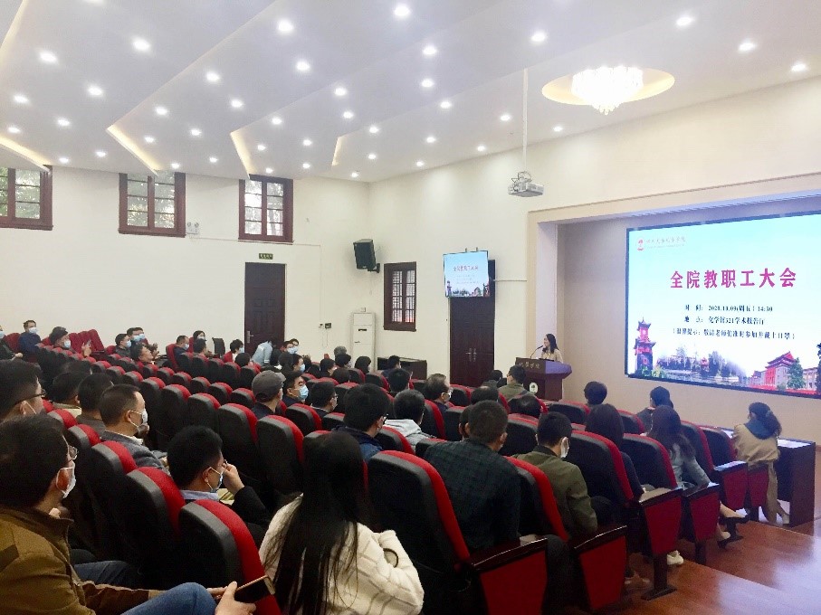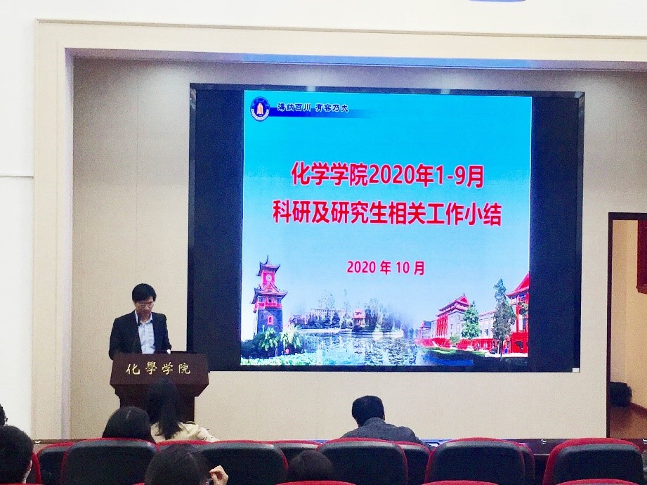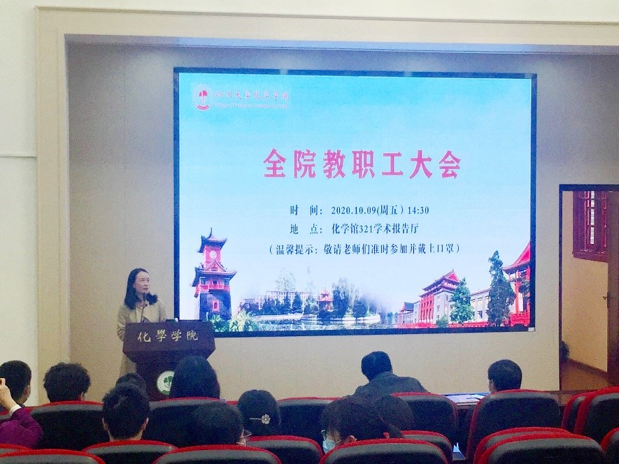 2020年10月9日下午,在化学馆321报告厅召开了化学学院全院教职工大会,总结上半年学院工作,对本学期的教学、科研、管理等相关工作进行了研讨。会议由学院党委书记谢均主持。