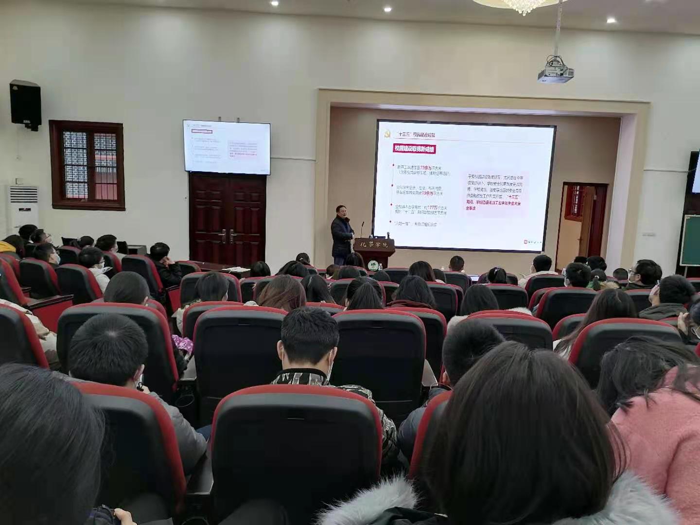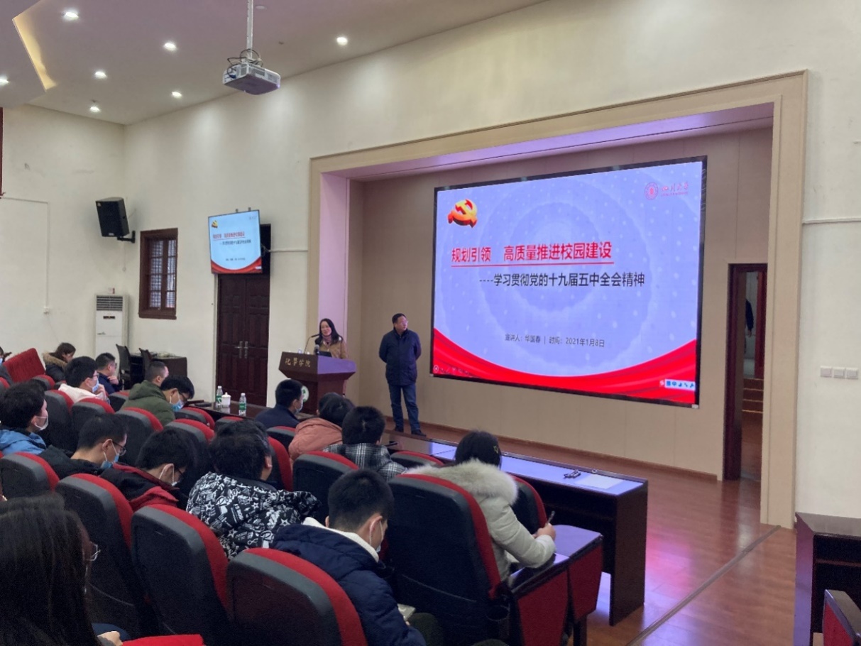 为深入学习贯彻党的十九届五中全会精神,领会十四五规划的科学内涵,全面加快推进我校“两个伟大”奋斗目标,在两个一百年交汇之际以更好的成绩献礼建党100周年。202118日下午14:30,在化学馆321报告厅,我院邀请了学校十九届五中全会精神宣讲团成员、基建处华国春处长,为我院全体党员师生开展了题为《规划引领,高质量推进校园建设—学习贯彻党的十九届五中全会精神》的报告会。