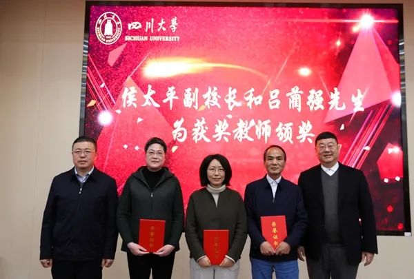 (侯太平副校长、吕蔺强先生为获奖教师颁奖并合影留念)