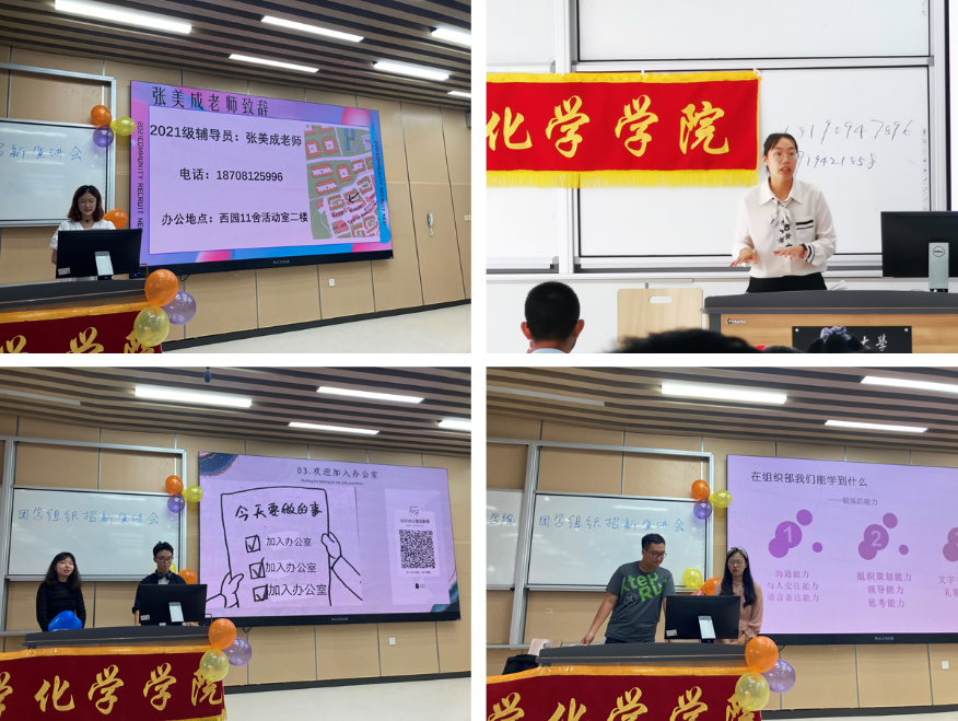 9月5日上午,化学学院团学组织招新宣讲会在综C307教室进行,辅导员张美成老师致辞,随后化学学院团委学生会的组织部、宣传部、文体部、青志、办公室、权益部、科创部、公关礼仪部等部门和创意化学社、篮球队、足球队、辩论队等团体进行了宣讲。此次招新结束后,学院团委学生会后续将举办丰富多彩的课余活动,给同学们提供提升自我的平台。