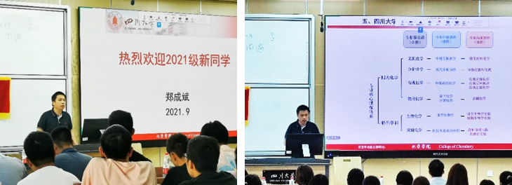 9月6日下午,郑成斌副院长在综C307教室,为2021级新生进行了学院的本科教育及培养情况介绍。郑成斌教授详细讲解了当前化学学院的人才培养计划,包括拔尖班、基地班、强基计划等,强调了培养方案中同学们需要注意和关注的问题,并勉励新同学积极进取、热爱化学、脚踏实地,最终学有所成。