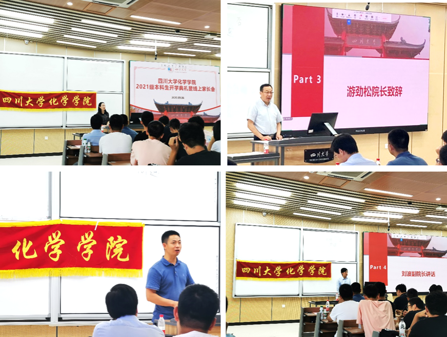 9月6日下午,四川大学化学学院2021级本科生开学典礼暨线上家长会在江安校区综C307教室举行。化学学院党政领导、辅导员和全体2021级本科新生及家长参加了此次活动。谢均书记主持开学典礼并致辞,游劲松院长、刘波副院长、李坤副院长、郑成斌副院长分别讲话。各位领导对新同学的到来表示了热烈的欢迎与祝贺,并对新同学的大学生活和学习提出建议与要求。