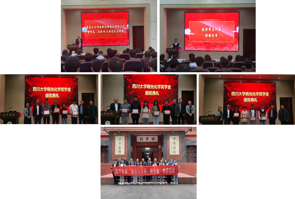 2021年10月20日上午,2020-2021年度“晓光化学奖学金”颁奖仪式在化学馆321会议室隆重举行。化学学院79级校友、青岛三力本诺新材料股份有限公司董事长总经理王晓光先生,副总经理王科先生,人力资源总监姚霞清女士,佳化化学(上海)有限公司CEO李玉博先生,研发经理夏凉先生,四川大学教育基金会副秘书长贾秀娥女士,化学学院院长游劲松教授,党委书记谢均教授及部分老师出席了此次颁奖仪式。