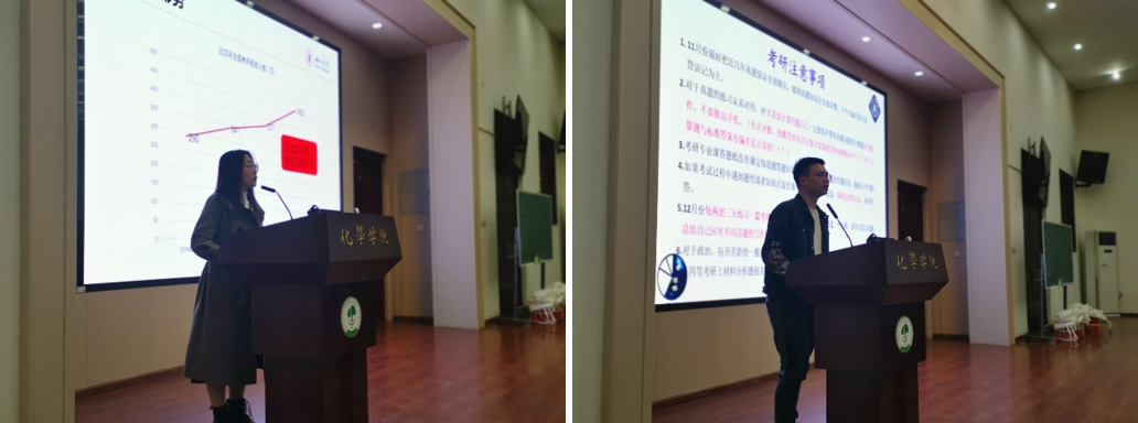 首先,游劲松院长肯定了同学们在备考过程中付出的努力,分析了近几年学院的考研和录取情况,并结合自己的考研经历,鼓励同学们充分把握最后的冲刺复习时间,加油备战,勇于应考,力争考入目标院校。随后,化学学院2021级研究生于晓燕以自身的备考为例进行了考研经验分享,强调了考试前、考试中及考试后的注意事项,鼓励同学们通过多种方式调节考研心态。化学学院2019级研究生李梦晨分享了近几年的考研形势,分析了考研难点重点的复习方法,提示同学们在最后冲刺期阶段的复习中要有策略上的调整。最后,谢均书记引导同学们在接下来的冲刺备考中继续努力,多练题,调整好心态,同时要注意身体健康,劳逸结合,鼓励同学们坚持到底,不负自己的辛勤付出!老师们还为考研学生发放了学院精心准备的考研加油包,祝愿同学们考研成功!