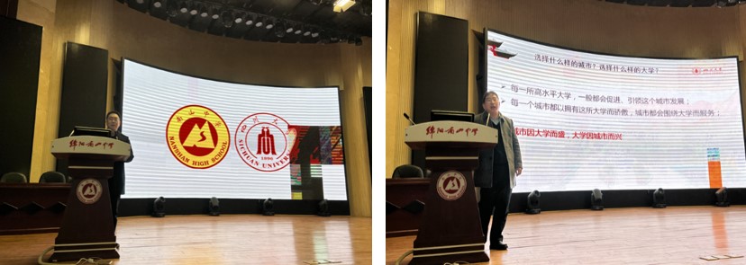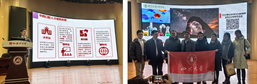 12月30日下午,由化学学院牵头组织的招生宣传团赴绵阳南山中学开展招生宣传。由四川大学招生办公室副主任廖爱民带队,化学学院郑成斌副院长、商学院李小平副书记、商学院张攀副研究员、华西口腔医学院张雪峰医生、招办宣传科副科长陈爽老师和化学学院招生宣传联络员马晓爽老师一行参加了本次招生宣传工作。