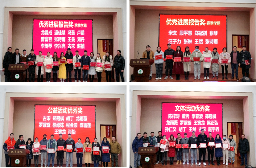 总结会后进行了隆重的颁奖仪式,除了实验室奖励条例中规定的“好师兄/师姐奖”、“优秀本科生奖”在暑期期末评选颁奖外,其他单项奖都在本学期期末评选和颁奖。 实验室副主任吴刚教授宣读了2021年度获得实验室各单项奖获奖人员名单,包括:优秀进展报告奖、学术活动奖、技术开发与成果奖、科研难题挑战奖、公益活动优秀奖、文体活动优秀奖以及实验室主任奖共7项,总计有107人次(61人)获得了各项奖励。在热烈的掌声和激昂的音乐中,实验室各位老师为获奖同学颁发了荣誉证书,并鼓励大家继续努力,向优秀同学看齐,共同为实验室的进步付出自己的一份力。