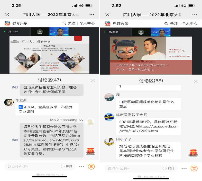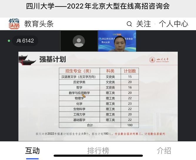 应北京教育头条邀请,4月16日14:00,四川大学北京招生工作组组长、化学学院副院长郑成斌教授为北京地区的考生及家长带来一场线上招生宣讲,化学学院、华西临床医学院、华西口腔医学院、匹兹堡学院等院系招生组老师参与了线上答疑,与北京地区的考生和家长积极互动。本次参与线上宣讲的考生及家长达6000余人次。