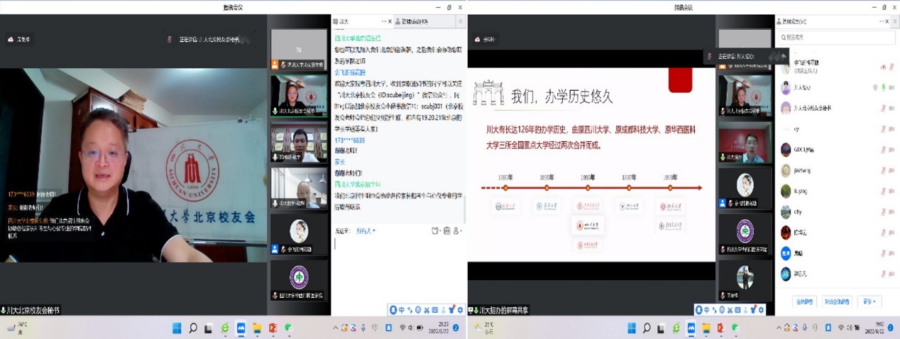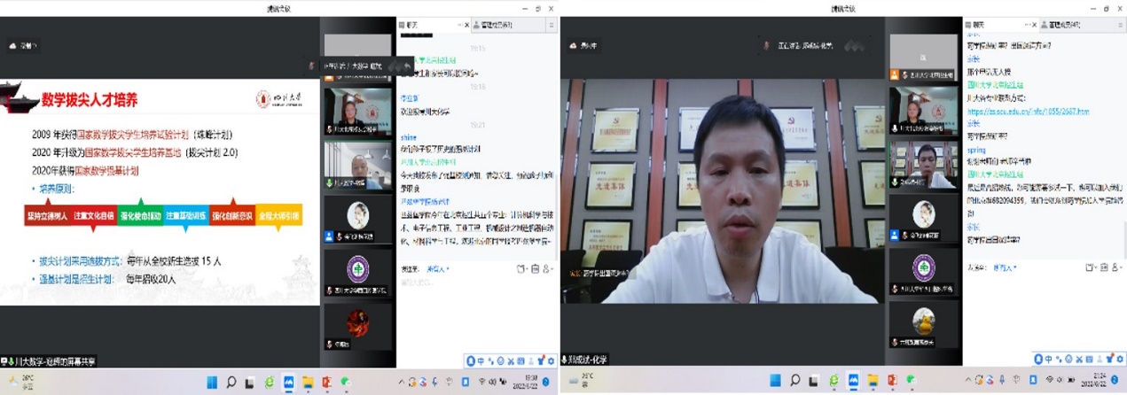 6月22日19:00,化学学院牵头开展北京线上招生宣讲会,宣讲会由四川大学北京校友会秘书长李博老师主持,川大招生办公室、数学学院、华西口腔医学院、电气工程学院、经济学院、匹兹堡学院的相关老师参与了招生宣讲和答疑。招办廖爱民副主任首先向考生和家长介绍了天府之国—成都的环境、经济和交通状况,展示了四川大学的历史底蕴及“厚通识、宽视野、多交叉”的本科教育特色和丰富多彩的校园生活,并介绍了四川大学的招生录取政策。接着,来自文理工医各学院的老师分别介绍了各自专业的学科实力、本科生培养、就业深造等情况,并回答了考生和家长们的提问。最后,四川大学北京招生组组长、化学学院副院长郑成斌教授做了总结发言,鼓励北京的考生积极报考四川大学。