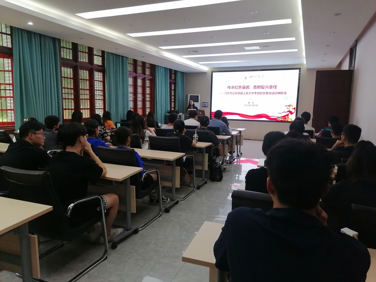 首先,谢均书记介绍了习近平总书记在中国人民大学考察的概况和讲话的主要内容。习总书记殷切希望全国广大青年牢记党的教诲,立志民族复兴,不负韶华,不负时代,不负人民,向英雄学习、向前辈学习、向榜样学习,争做堪当民族复兴重任的时代新人,在实现中华民族伟大复兴的时代洪流中踔厉奋发、勇毅前进。接着,讲解了习总书记的青年观,党和国家的希望寄托在青年身上,青年要有责任有担当,青春才会闪光。之后,回顾了川大的红色记忆,鼓励同学们要传承红色基因,勇担复兴重任,在青春的赛道上奋力奔跑,争取跑出当代青年的最好成绩。