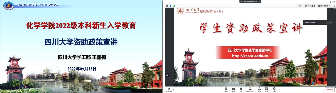 为积极响应国家和学校号召,切实保证各类、各项资助政策落到实处,解决家庭经济困难同学的后顾之忧,2022年9月12日上午,化学学院通过线上的形式召开了四川大学资助政策宣讲会,学工部王丽梅老师担任主讲,化学学院辅导员张若一老师以及2022级本科新生参加了本次活动。