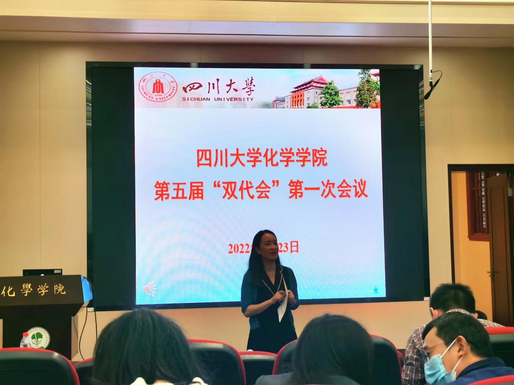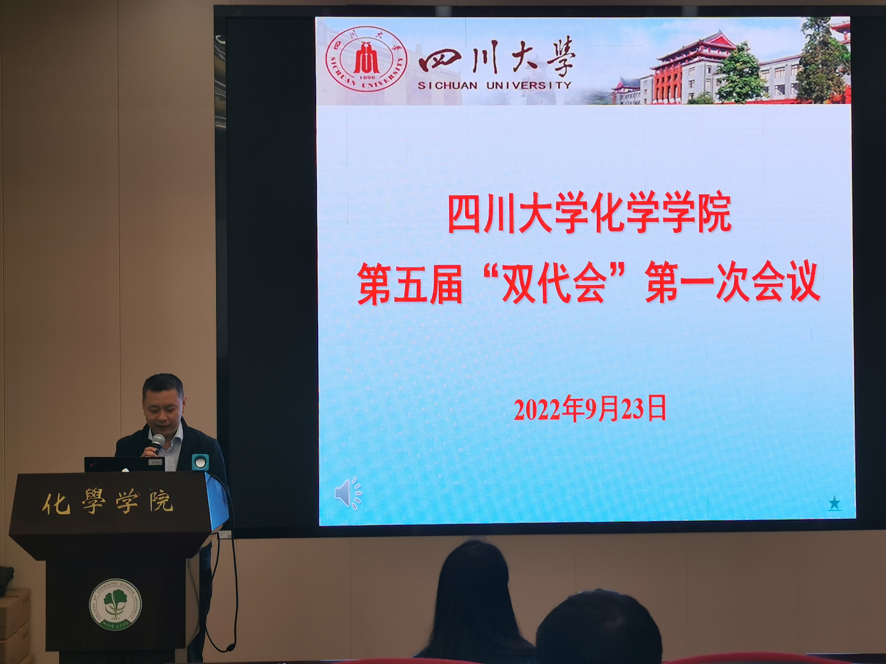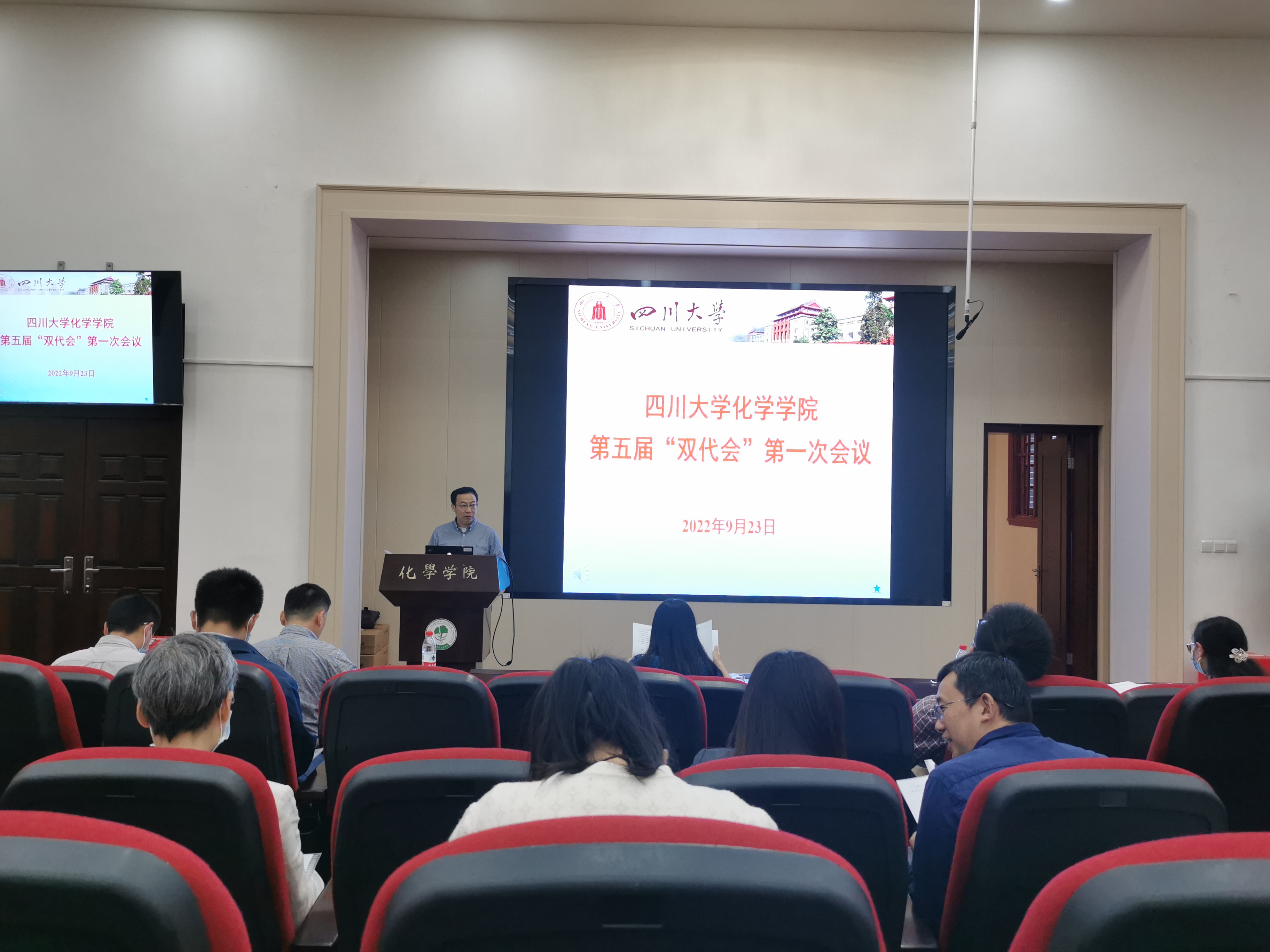 2022年9月23日,四川大学化学学院第五届教职工代表大会暨工会代表大会第一次会议在化学馆321报告厅隆重召开。本次大会的主题是“聚焦“双一流”、奋进“十四五”,凝心聚力推进学院高质量内涵发展。学院双代会代表出席本次会议,大会由学院党委书记谢均同志主持,大会执行主席为学院党委副书记肖波同志。