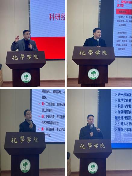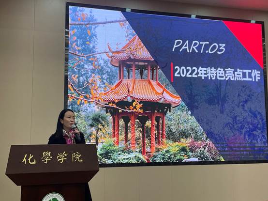 谢均书记作了2022年化学学院年度工作总结,重点介绍了学院党建和事业融合发展的特色亮点工作,报告了学院在党建、学科建设、人才队伍、学生培养、科学研究、管理服务等各项工作中取得的成效,同时也分析了存在的不足和改进措施。随后,谢书记做了2022年度个人述职报告,重点从“七个”维度介绍了书记抓党建工作情况。最后,谢书记对老师们一直以来的辛勤付出表示衷心的感谢!
