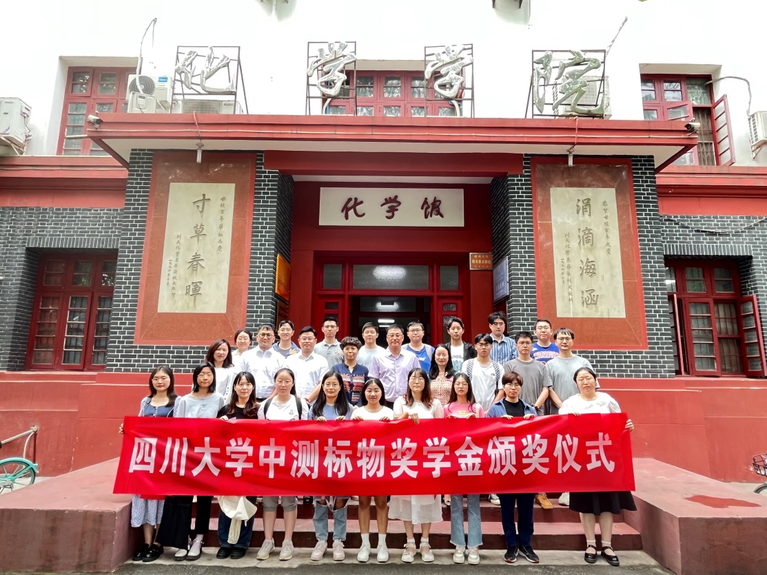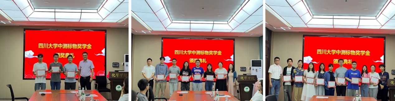 2023年6月2日下午,四川大学“中测标物奖助学金”颁奖典礼在化学馆122会议室举行。四川中测标物科技有限公司创始人方正、总经理杨嘉伟、总工程师张鹏辉,化学学院党委书记谢均、汪秀丽老师、辅导员及获奖同学参加本次颁奖。
