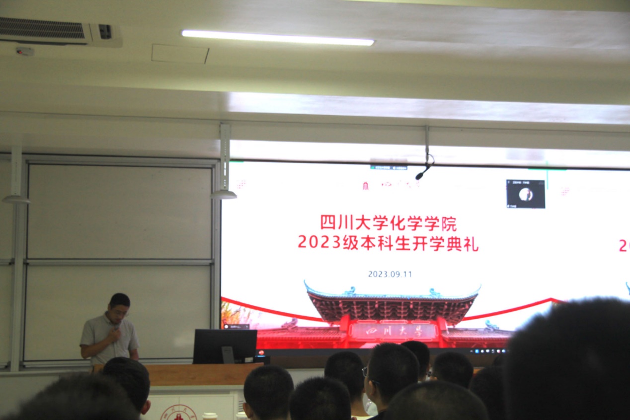 9月11日晚,四川大学化学学院2023年开学典礼在江安校区综合楼C 107隆重举行,四川大学副校长、化学学院院长游劲松,化学学院党委书记谢均、副院长郑成斌、副院长李坤、党委副书记肖波、教导员王毅、2022级本科生辅导员张若一、2023级本科生辅导员浩涛涛,2023届化学学院新生出席典礼,家长以线上会议的形式参加此次活动。开学典礼由肖波主持。