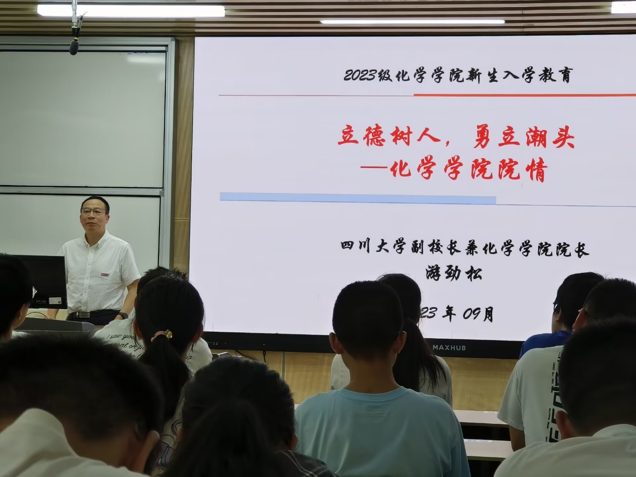 为了落实立德树人的根本任务,培养学生的家国情怀,争做能够勇立潮头、堪当大任的社会主义新人。9月13日下午,在江安校区综合楼C207,化学学院2023级本科新生入学教育讲座“立德树人,勇立潮头-化学学院院情介绍”顺利举行。本次讲座由四川大学副校长、化学学院院长、化学与绿色化工科(群)首席科学家游劲松教授主讲,由学院党委副书记肖波主持。辅导员及全体学院2023级本科新生参加了本次讲座。