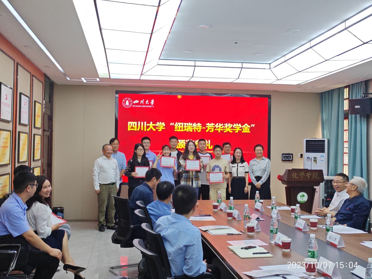 10月7日,在四川大学化学馆122会议室举行了首届四川大学“纽瑞特-芳华奖学金”颁奖典礼。中国科学院柴之芳院士,纽瑞特创始人钱积惠研究员、总经理蔡继鸣研究员,四川大学教育基金会陈森秘书长、贾秀娥副秘书长,化学学院党委书记谢均、党委副书记肖波、李首建教授、马利建教授、丁颂东教授,四川大学原子核科学技术研究所副所长韩纪锋、副院长刘宁、所长助理杨吉军等专家领导以及所有获奖学生参加颁奖典礼。颁奖典礼由肖波主持。