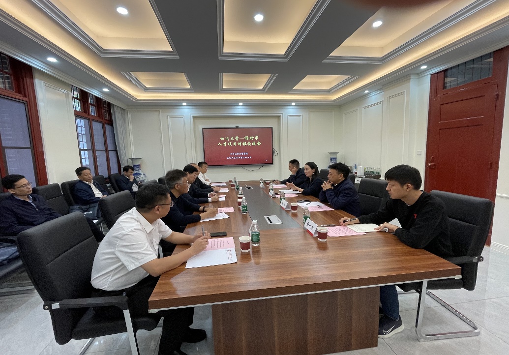2023年10月23日上午,四川大学—潍坊市人才项目对接交流会在化学馆103举行。山东省潍坊市委组织部副部长,市人力资源和社会保障局党组书记刘太福、潍坊市人力资源和社会保障局、潍坊市人力资源服务集团有限公司、昌邑市人力资源和社会保障局有关负责同志陪同参加会议。学院党委书记谢均、青岛三力本诺化学工业有限公司副总经理王智猛、副院长李坤、陈华教授、叶剑衡教授参加会议。会议由李坤副院长主持。