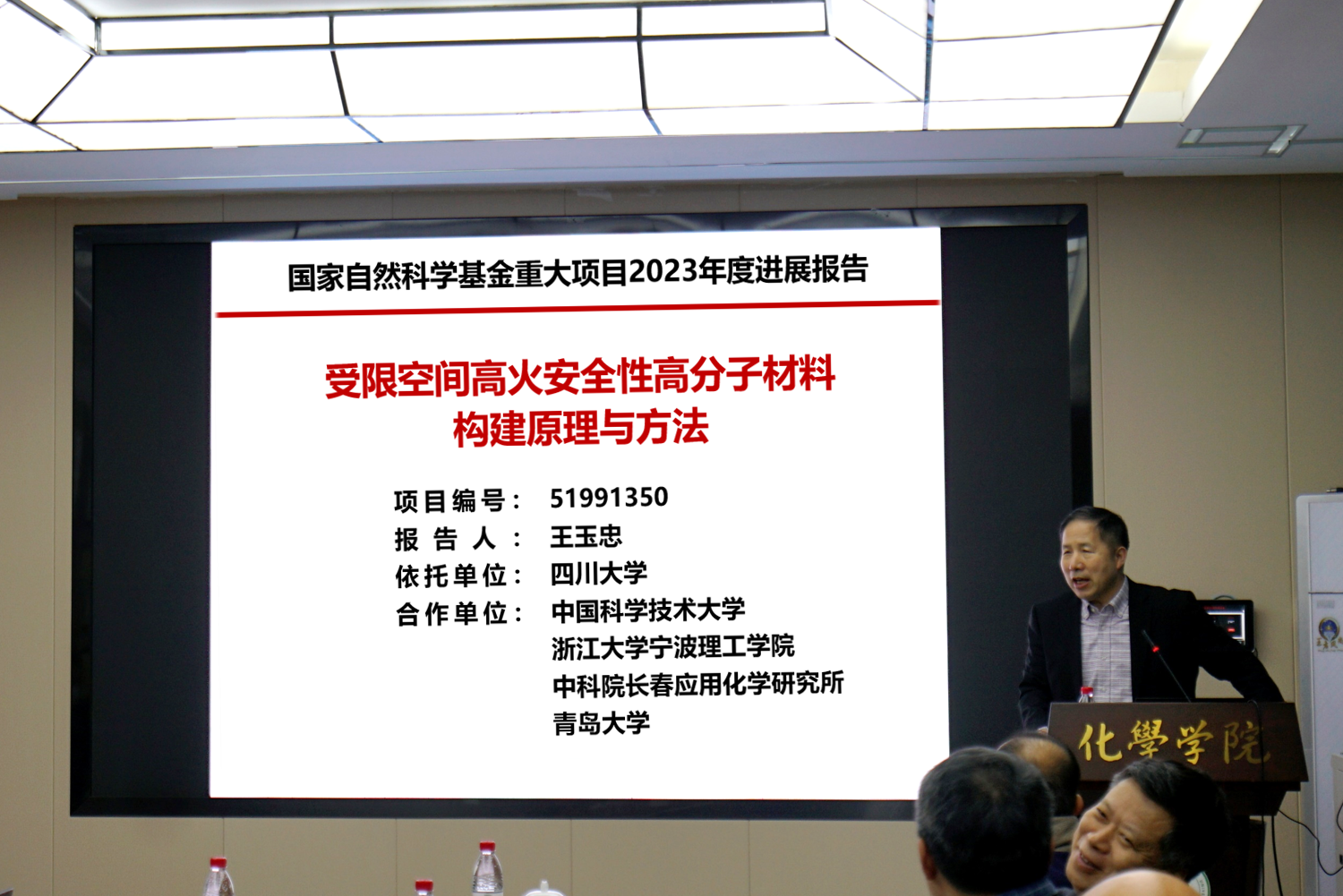 我院王玉忠院士牵头承担的国家自然科学基金重大项目“受限空间高火安全性高分子材料构建原理与方法”2023年度项目进展报告会于2024年1月15日在四川大学化学馆122召开。国家自然科学基金委工材学部的马劲处长,我校褚良银副校长,重大项目学术指导组专家、以及项目各课题负责人与研究骨干等出席会议。会议由王玉忠院士主持。