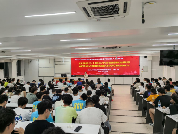 2024年9月12日,化学学院党委书记谢均教授在江安校区综合楼C107,为化学学院2024级本科新生带来入学教育讲座——“以党的二十届三中全会精神为引领,成可堪大用能担重任的可靠接班人”。2024级辅导员侯鹏飞老师和化学学院2024级全体本科新生参加此次讲座。