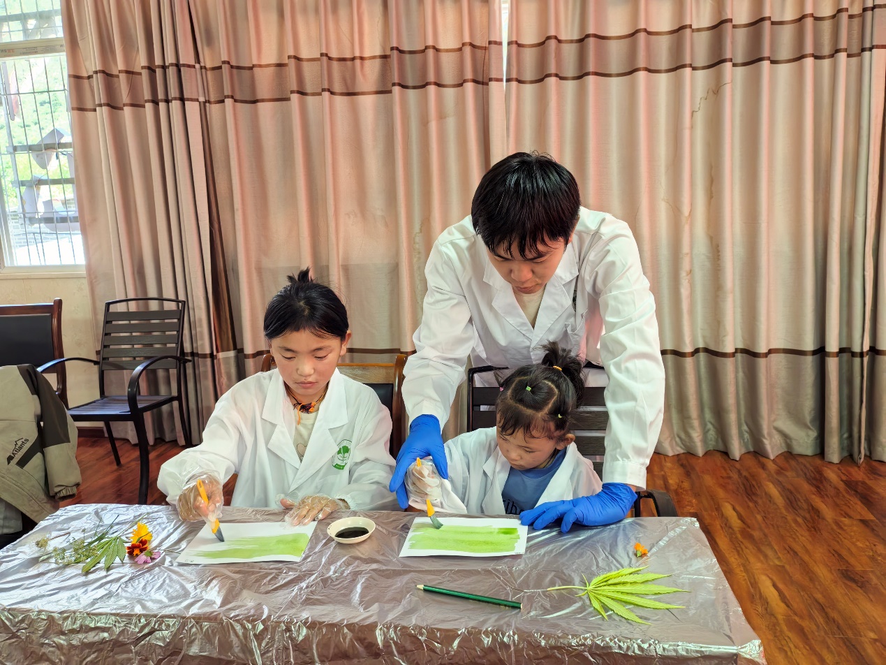 蓝晒,是一种古老的染色技术,利用铁盐与光的化学反应,在阳光照射中产生蓝色影像。团队带领壤古村的孩子们涂刷蓝晒液、裁剪设计图案、融合当地植物制作独特的化学工艺品。值得一提的是,团队准备了一张去年暑假科普活动所拍摄的照片——“大眼睛”小姑娘忠尕聚精会神注视着“水中花园”实验,而这次忠尕也亲自将这张有意义的照片晒了出来。“我会好好留着做纪念的”,她捧着那张珍贵的礼物满足又激动地告诉实践团队的老师同学们。