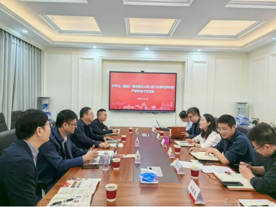 10月18日,泸天化(集团)有限责任公司副书记赵元柱带队来我院开展产学研合作交流,四川大学化学学院谢均书记、肖波副书记、李峰副院长、郑柯教授等出席了本次会议。
