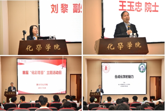 首先由刘黎教授代表学校教务处介绍了学校拔尖创新人才培养的整体情况,对化学学院近年来在拔尖计划、强基计划学生培养方面工作表示肯定,希望同学们可以利用本次交流活动提升科研综合能力。随后,王玉忠院士对同学们表达了深切的寄语,结合个人学术科研经历,希望同学们充分把握本科学习时光,利用学校和学院提供的有利平台,找准科研兴趣点,并持之以恒地努力奋斗。本次活动特邀拔尖计划毕业生代表、武汉大学程强教授带来“合成化学的魅力”主题报告,从自己的求学成长经历出发,鼓励与会同学坚定科研发展信心和决心,并介绍了合成化学的主要研究内容和发展。