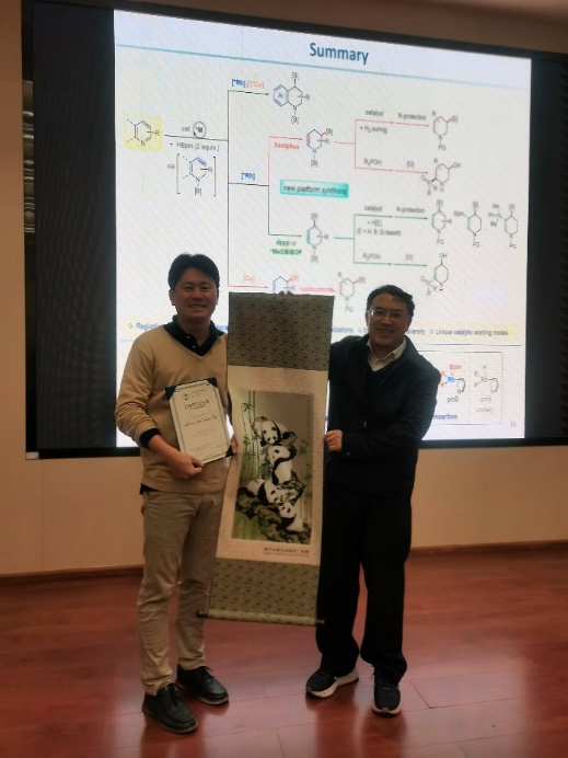 Sehoon Park副教授作了题为“Double and Triple Hydroelementation of Pyridines”的报告,详细介绍了过渡金属催化的喹啉和吡啶的双重和三重氢元素化反应的最新研究成果。
