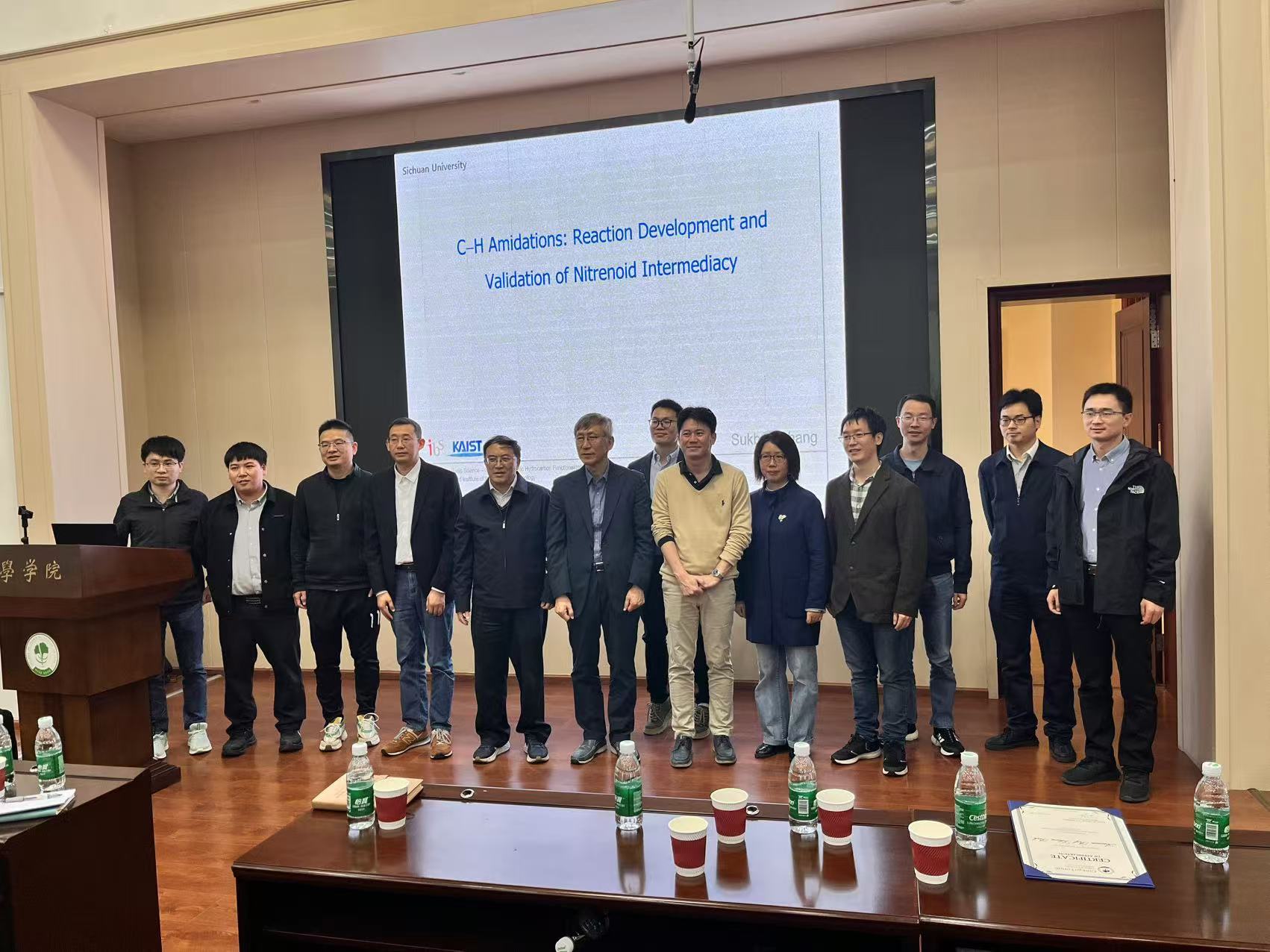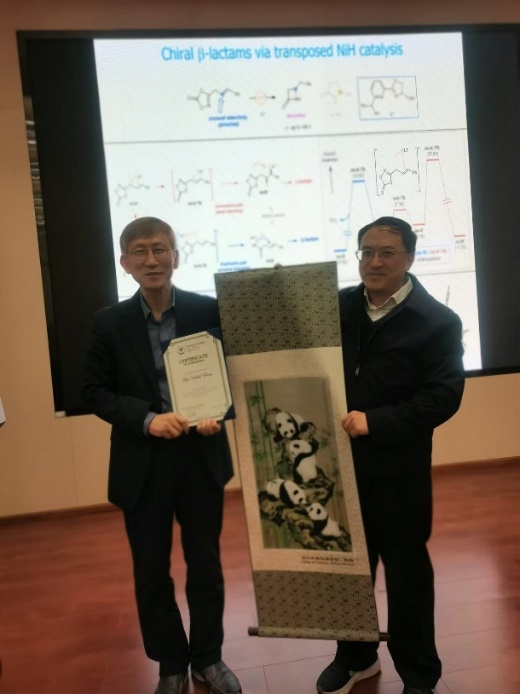 此次报告由化学学院冯小明院士主持,并为Sukbok Chang教授、Sehoon Park副教授颁发荣誉证书和赠送蜀锦。刘小华教授、曾小明教授、余达刚教授、郑柯教授、董顺喜教授、夏莹教授、谭光映教授、曹伟地教授、蒲茂坪副教授、周宇乔副教授等老师及学生参加了报告会。
