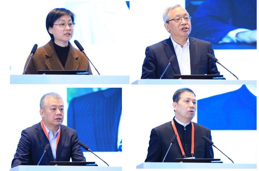 图2 四川大学副校长韩芳教授、中国石油和化学工业联合会赵俊贵副会长兼秘书长、中国循环经济协会副会长原庆丹、中国生物多样性保护与绿色发展基金会周晋峰创会理事长开幕式致辞