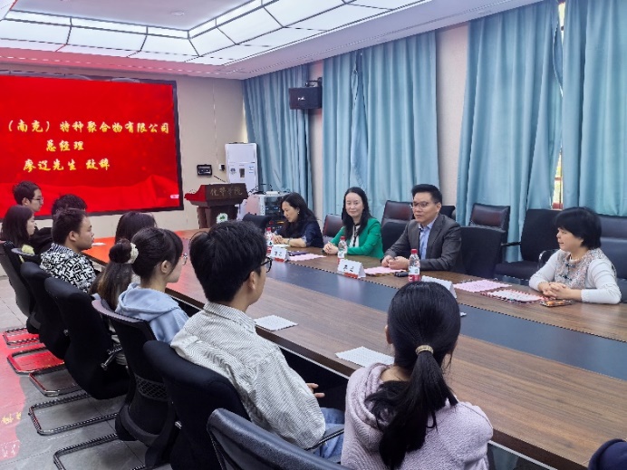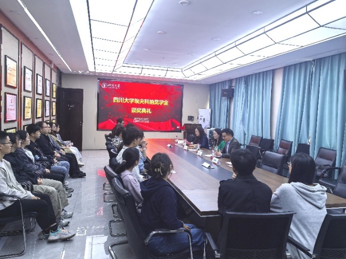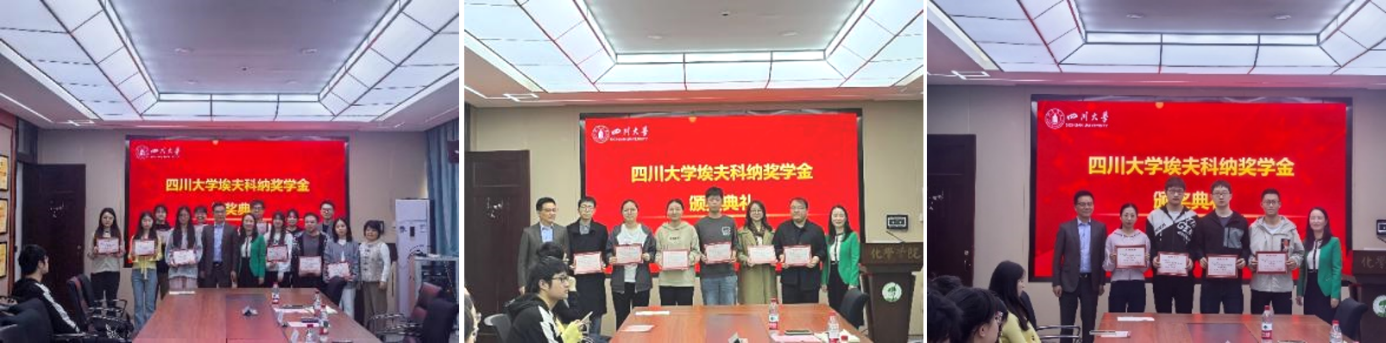 2025年4月24日上午,2023-2024年度埃夫科纳奖学金首届颁奖典礼在化学馆122会议室举行。埃夫科纳(南充)特种聚合物有限公司总经理廖辽,化学学院党委书记谢均、副书记肖波、夏传琴教授、辅导员以及获奖的同学参加了此次颁奖典礼,颁奖典礼由杜晓燕主持。