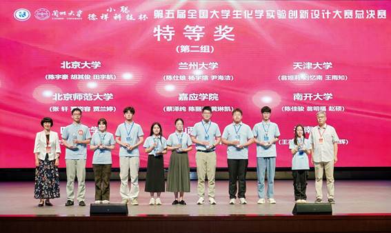 2025年8月21日-24日,“小聪-德祥科技杯”第五届全国大学生化学实验创新设计大赛总决赛在兰州大学城关校区成功举办。化学学院2022级本科生孙弈文、李佳佳、蒋涵宇三位同学的改进实验作品“苯甲醇的绿色选择性氧化”以西南赛区一等奖的优秀成绩冲入总决赛,经过激烈的角逐,从1000余支参赛队伍中脱颖而出,斩获全国总决赛特等奖。本次参赛作品的指导教师为化学实验中心任小雨博士、化学学院王天利教授。