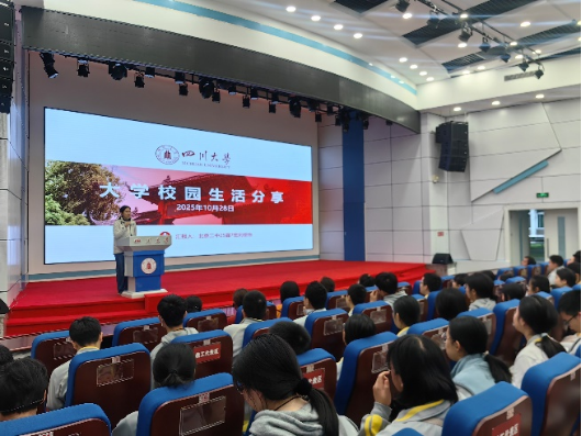 最后,师生们来到东三教演播厅。化学学院副院长李峰教授以“川越精彩,大有可为”为主题,为同学们带来了一场深入浅出的讲座。他系统介绍了川大的学科优势、科研成果与校园文化,阐释了大学教育的意义与价值,激发了同学们对高等教育的浓厚兴趣,也为他们的学业规划提供了有益指导。随后,毕业于北京二中、现就读于四川大学国关学院的刘佳怡同学,与学弟学妹们分享了入学两个月来大学校园生活,从适应新环境到参与社团活动,再到专业学习的探索,她的真诚分享让高中生们对大学生活有了更直观的理解,也激励大家珍惜当下,为梦想不懈努力。