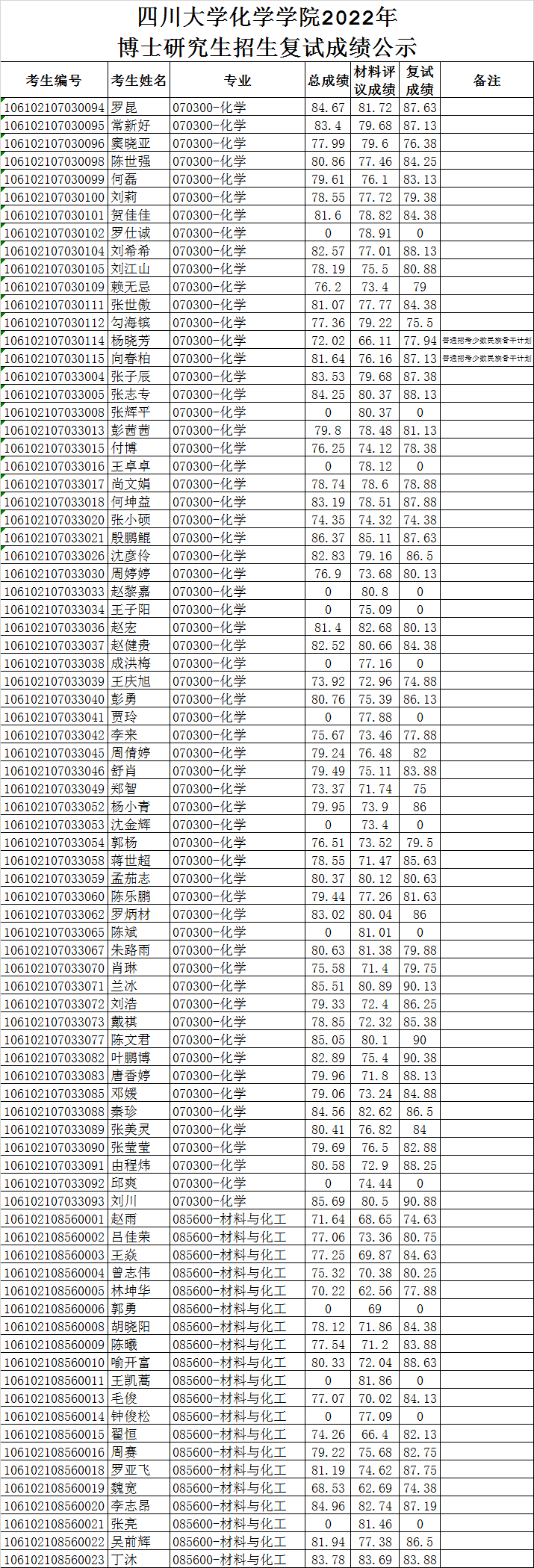 四川大学化学学院2022年博士研究生招生复试成绩公示