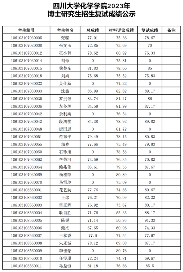 四川大学化学学院2023年博士研究生招生复试成绩公示