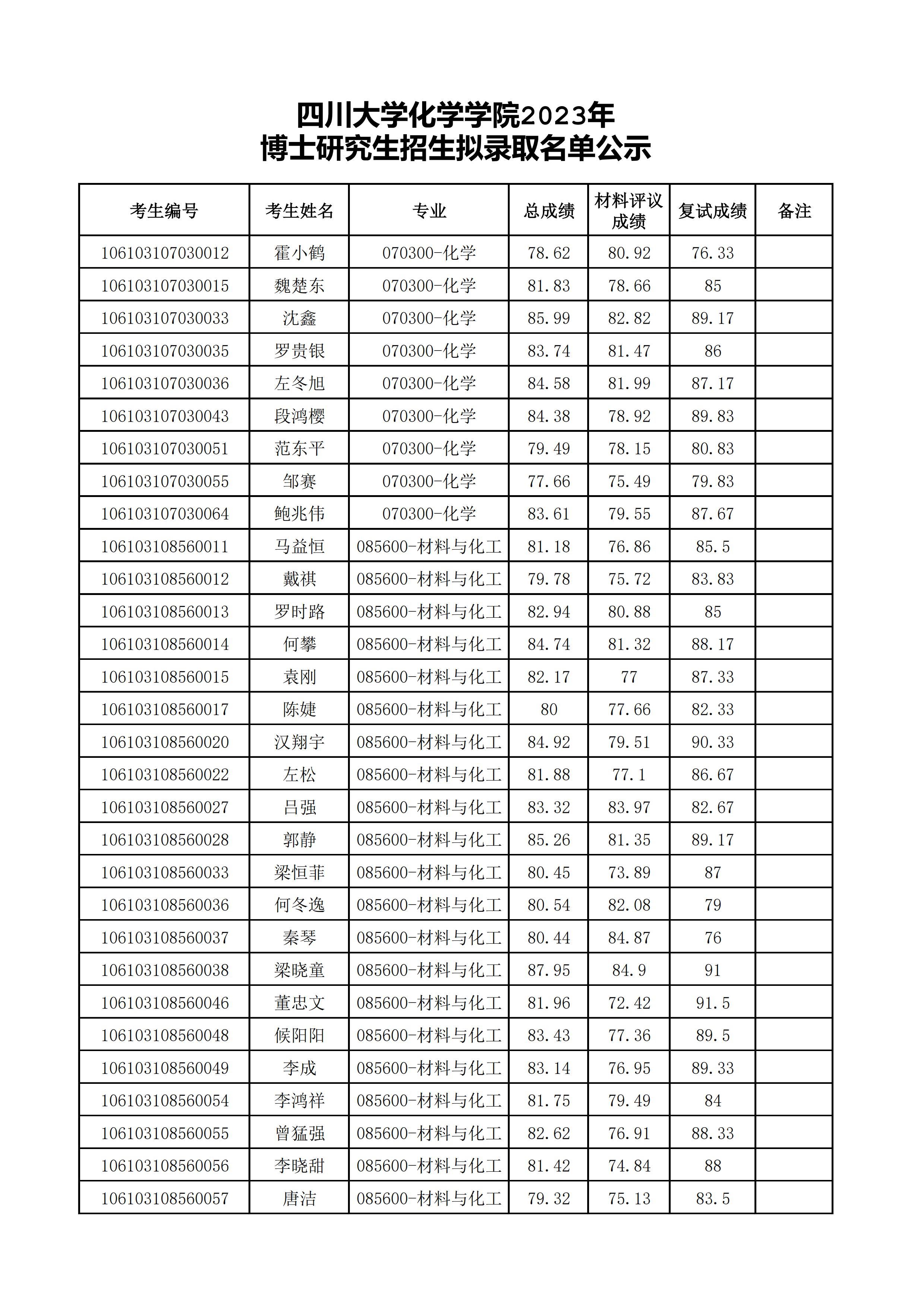 四川大学化学学院2023年博士研究生招生拟录取名单公示