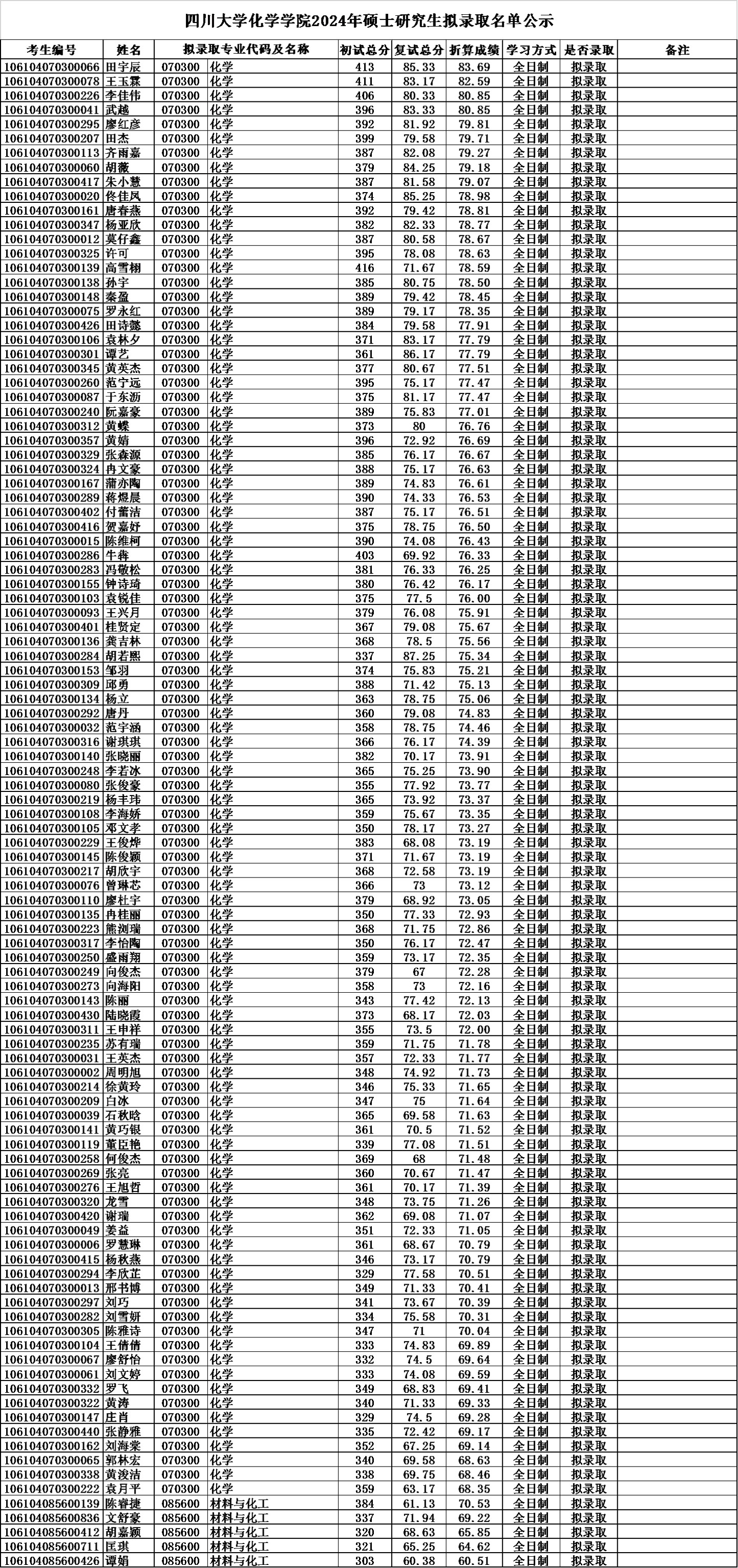 四川大学化学学院2024年硕士研究生拟录取名单公示