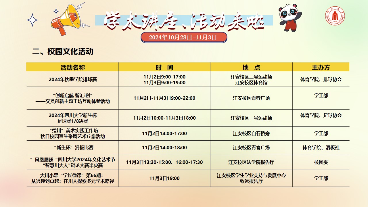 学术讲座论坛及校园文化活动预告(2024年10月28日-11月3日)