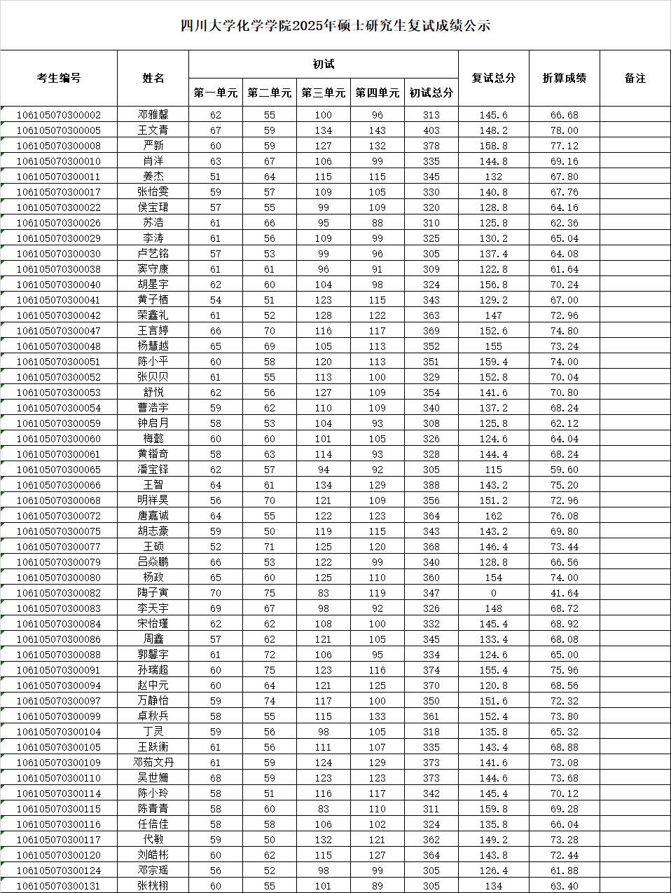 四川大学化学学院2025年硕士研究生复试成绩公示