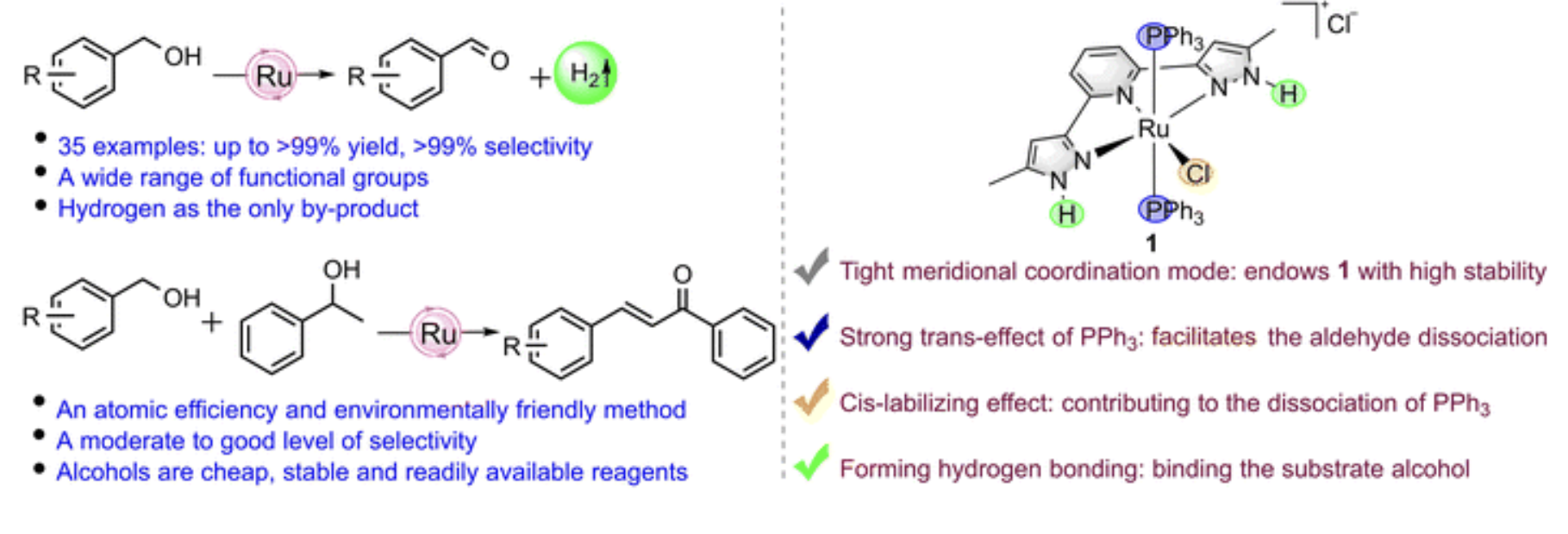 12. Chen, Y.; Cui, T.; Chen, H.Zheng, X.; Fu, H.*; Li, R.*, Pyrazolepyridinepyrazole (NNN) ruthenium(ii) complex catalyzed acceptorless dehydrogenation of alcohols to aldehydes. Dalton Transactions 2023, 52 (35), 12368-12377.