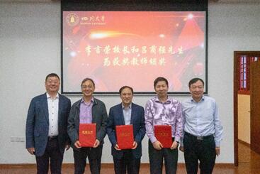 学院设立了“顺通奖教金”,每年奖励3人,每人10万元,专门用于奖励学院潜心教书育人的教师榜样。9月27日,四川大学化学学院举行了首届顺通奖教金颁奖典礼 (如图)。四川大学校长李言荣,四川顺通实业有限公司董事长、海纳同创控股有限公司总经理、化学学院79级杰出校友吕蔺强先生,以及学校外联办、化学学院全体老师和部分学生代表参加了典礼。首次获得奖励的冯小明院士、王玉忠院士和胡常伟教授(国家教学名师)为学院、学科和学校的发展都作出了突出的贡献。
