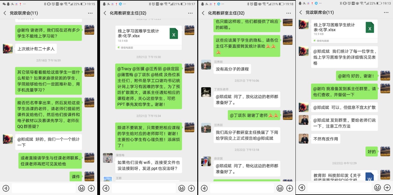 面对突如其来的疫情,按照教育部、四川省和四川大学相关通知要求,延迟春季开学返校时间,学院积极响应,做到“停课不停教,停课不停学”。全院师生按照既定的开学时间准时行课,开展网上教学指导与学习。前期学院领导班子通过多次线上党政联席会讨论,并联动教务口、学工口、任课教师摸排参与线上学习有困难学生名单、湖北籍和武汉籍学生,第一时间了解学生实际困难,采取多种模式帮助学生展开线上学习,如任课教师将电子课件以及视频通过QQ或邮件发给学生;同时拟采取任课教师与辅导员互动协调的工作模式,对每门课参与线上学习困难的学生进行询问进行追踪、联系和回访,确保电话、短信、微信和QQ进行答疑顺畅进行。此外,拟为困难学生提供通讯补助,便于通过手机在线学习。