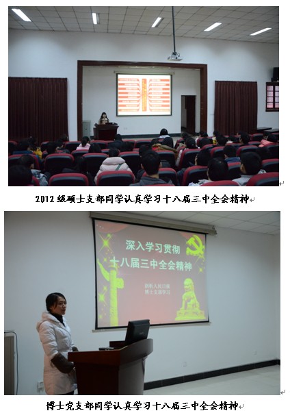 党的十八届三中全会召开以来,化学学院各个支部积极组织全体党员同学认真学习十八届三中全会会议精神,同时成立了“中国特色社会主义理论研究分会”学习小组,围绕《中共中央关于全面深化改革若干重大问题的决定》、习近平总书记一系列讲话等内容,对全体党员同学进行宣讲辅导,力求全面深入地宣传党的十八届三中全会精神,引导学生深刻领会、准确把握党的十八届三中全会的精神实质。