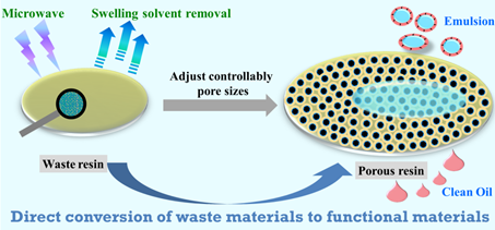 此项研究为废弃热固性塑料回收开辟了新的研究途径,拓展了新的应用领域,实现了“变废为宝”,并为设计孔径可调的油水分离材料提供了一种新思路。该研究成果发表在国际期刊《Materials Horizons》上,题目为“From waste epoxy resins to efficient oil/water separation materials via a microwave assisted pore-forming strategy”。第一作者为博士研究生田飞,通讯作者为王玉忠教授和徐世美教授。