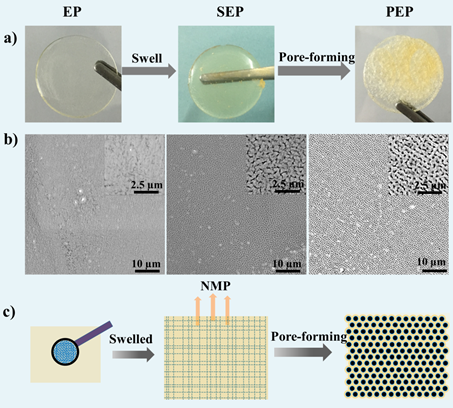 图2 EP,SEP和PEP的数码照片(a)和SEM图(b)及多孔PEP形成示意图(c)
