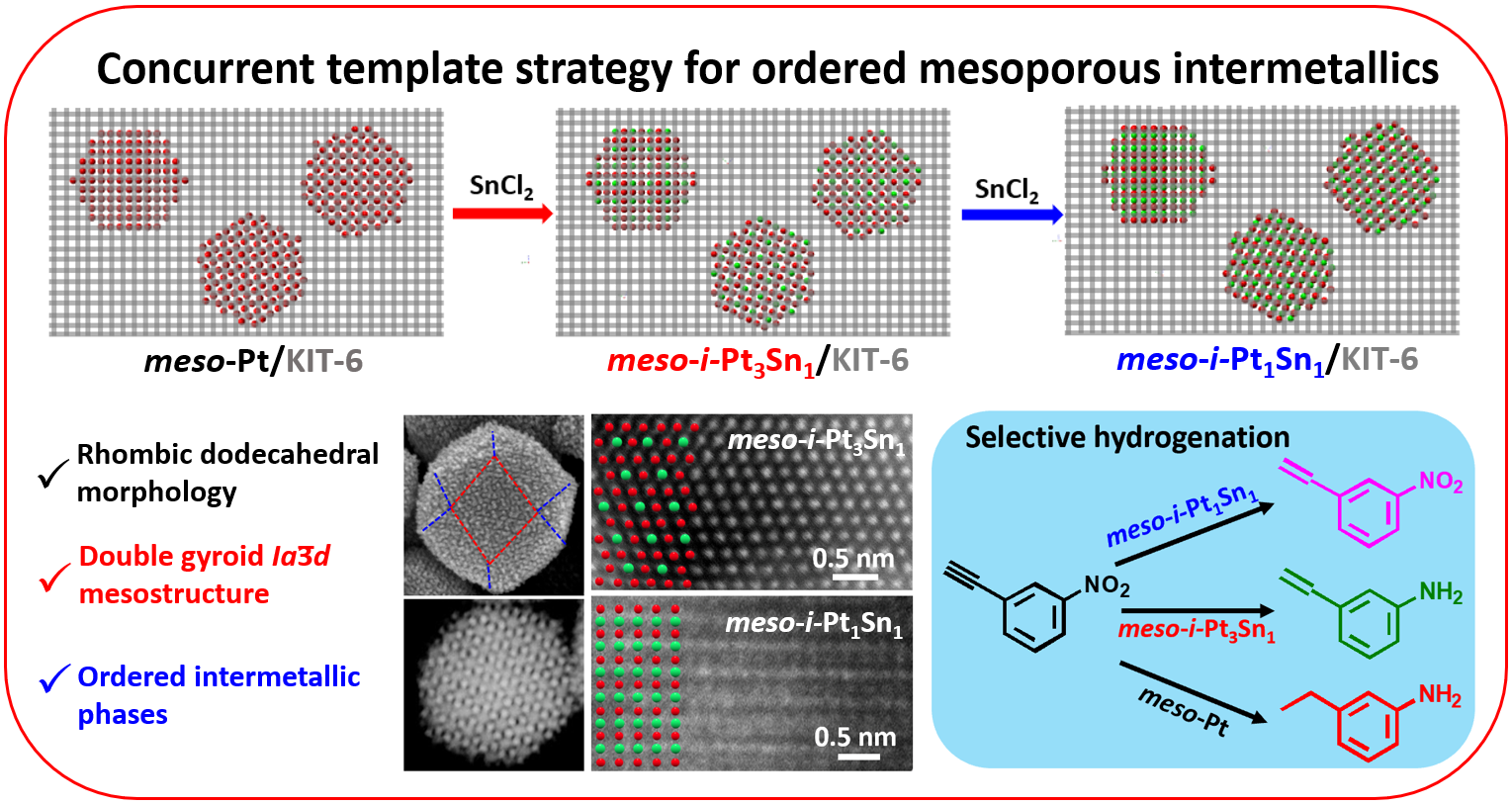 为了克服金属间化合物形成过程中容易聚集和形貌不易控等难题,刘犇课题组开发了一种通用的共生模板合成策略,精准合成了具有明确形貌、周期性的有序介观和原子有序的介孔金属间化合物纳米颗粒。同时评估了在有序介孔结构的协同作用下对3-硝基苯乙炔 (3-NPA)选择性加氢反应的金属间晶相依赖性催化性能,介孔金属间化合物PtSn表现出可控选择性和高稳定性。