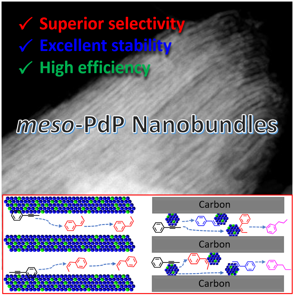刘犇课题组最近发现介孔金属的晶体孔道结构可以调节苯丙炔催化半加氢反应,实现了高附加值苯乙烯的高选择性。介孔金属的晶体孔道形成了显著的表面拉伸应变,产生一个狭窄的钳形空间,改变了催化反应中间体的吸附/解吸能力,在介观水平上激活了其在催化反应产物的选择性。