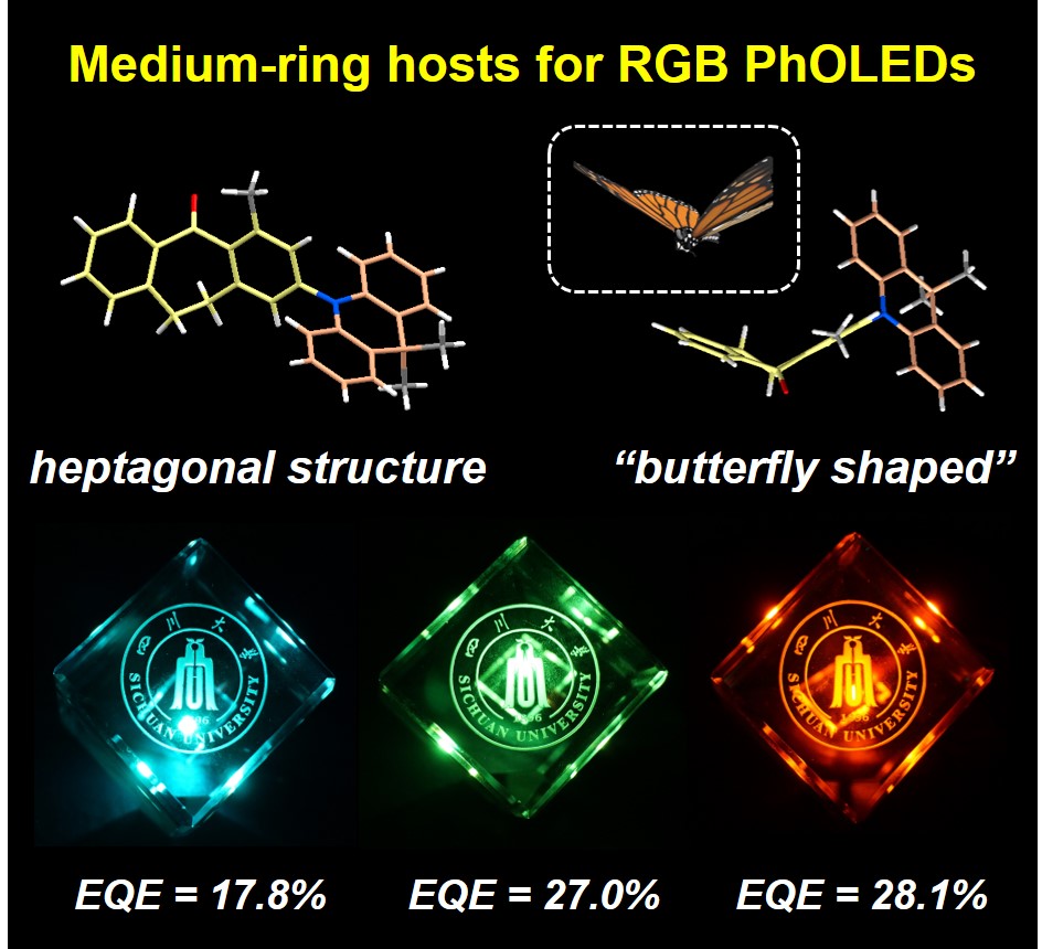 该研究以“Structurally Nontraditional Bipolar Hosts for RGB Phosphorescent OLEDs: Boosted by a “Butterfly-Shaped” Medium-Ring Acceptor”为题目发表在Angewandte Chemie International Edition上,四川大学为第一单位,化学学院游劲松教授和宾正杨副研究员为该论文通讯作者,马蔚欣博士为论文的第一作者。特别感谢国家自然科学基金委、四川省科技厅、四川大学的经费支持。